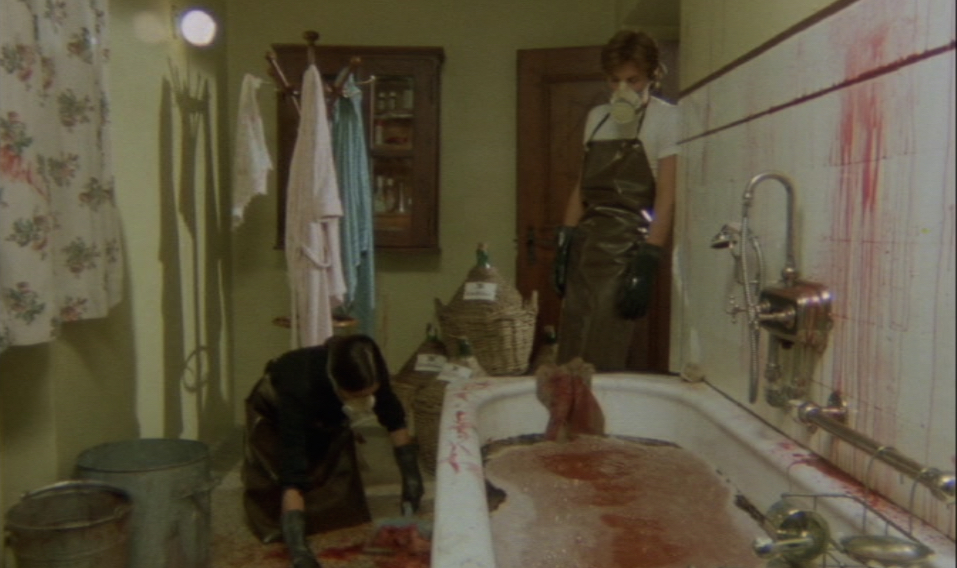 It later becomes clear that Iris is in on this plot, as Iris and Francesco take the hitchhiker into the bathroom where they chop her up into pieces. It doesn’t end there though, as they then pour acid over her in the bath to dissolve the body. The ‘remnants’ are then poured into a hole in the ground in the nearby woods.