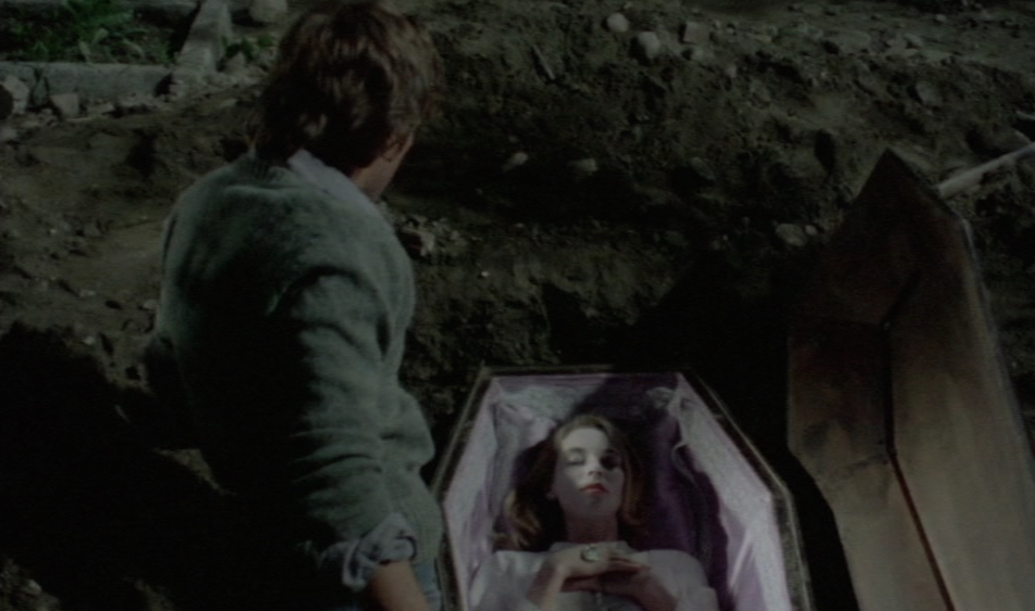 Predictably, whilst sealing the coffin with Teodora inside, she suddenly awakes and pushes the lid off, screaming, while the soundtrack blasts for one last time: The End.