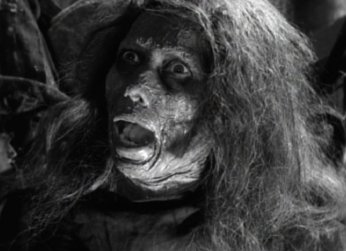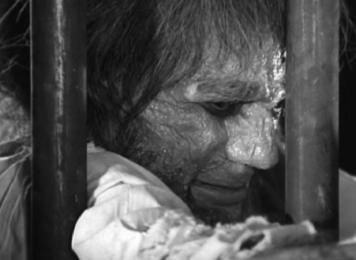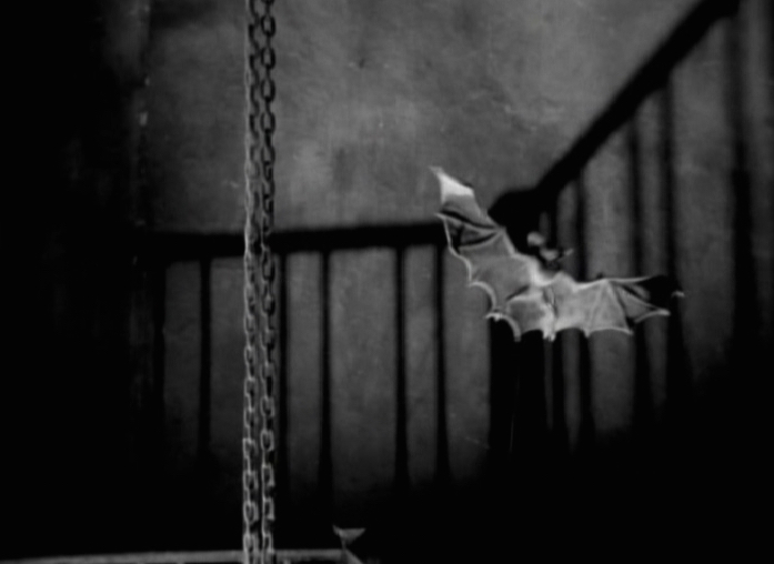Once the bat has been taken care of we see a hairy hand appear through the bars of a door into the adjoining room. With Herbert conveniently pressed up against the door, the hand reaches through and begins strangling Herbert. At this stage we see the hand belongs to a man, sort of a wolf-man, or a very hairy man at least. Herbert struggles and manages to break away, only to fall down the stairs.