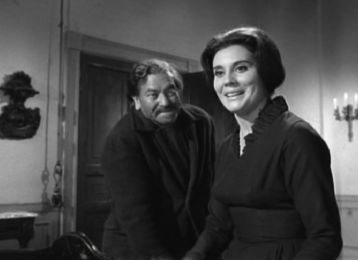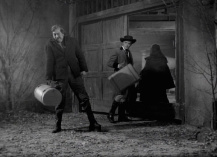 As the horseman leaves, Emily and Herbert notices Selma’s three dogs, barking wildly behind a fence. “What horrible animals” Emily comments before reaching for the knocker on the front door. Before she can either touch the metal though, the door is opened by Fred, sporting his usual creepy glare. Fred helps the pair with their luggage and informs them that Selma will return later that evening.