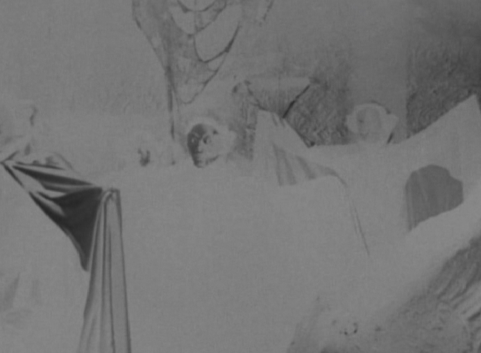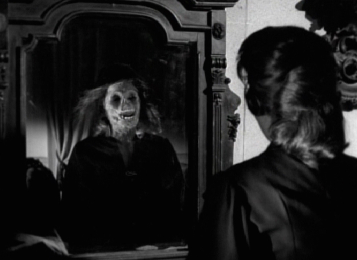 Slightly put out that her auntie isn’t there to greet her, Emily and Herbert go to their room and begin unpacking. After a time Herbert decides to go out for a little while, not sure where to seeing as the house appears to be in the middle of nowhere, and leaves Emily to finish unpacking. She notices that the mirror in the room has been covered with a black sheet which she removes. As she stares into the mirror, her image morphs into that of Selma’s (with no eyes this time) and then into that of a skull. This is a very effective and creepy moment. Very simple but works really well.