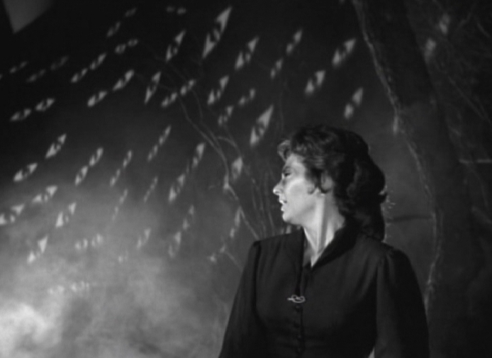 In despair, Emily looks at the moon, realising that midnight is drawing closer and as the distant sounds of the wailing witch are heard, Emily’s eyes begin to change. As her insanity builds, mysterious eyes appear in the sky and in the trees, watching over Emily with relentless stares. Whilst this is quite a cheap effect (I am guessing the image of the eyes is simply being projected onto the background), it is a really memorable scene and again there is something charming about the way the effect has been put together.