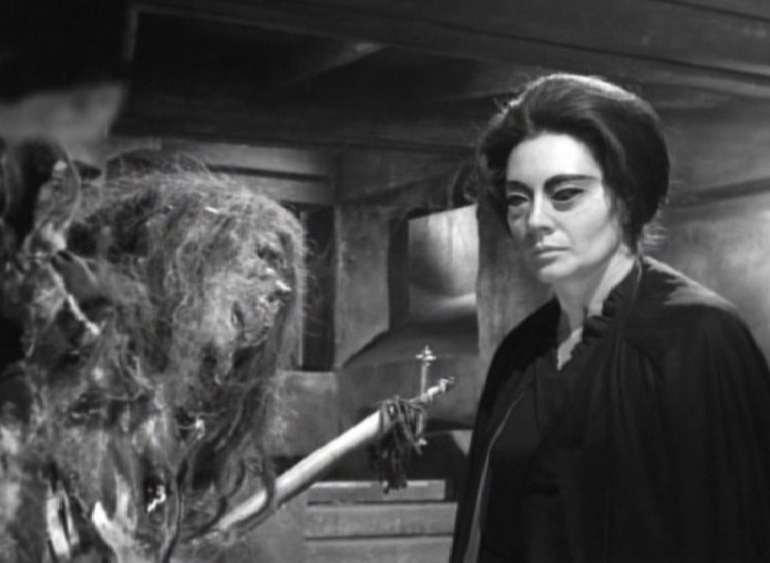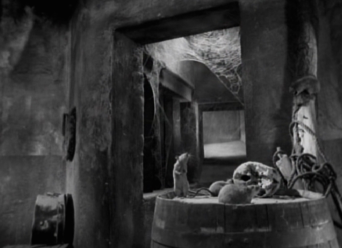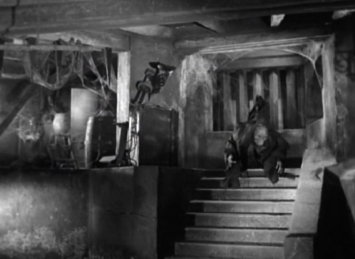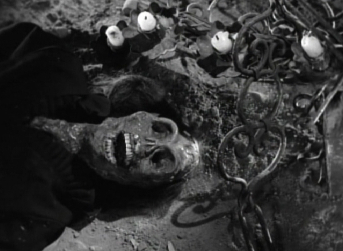 Back at the house, Herbert has fallen (physically and metaphorically falling in to her trap) through a trap door operated by Selma in the bell tower, landing in the room where the corpse of the wailing witch is. The geography of the house seems a bit off at times. The room where the corpse of the wailing witch is would seem to be in the basement, but Herbert landed here after going through the trap door at the top of the bell tower. However, it looks like the only thing that would have been below the bell tower would be the stair case itself.