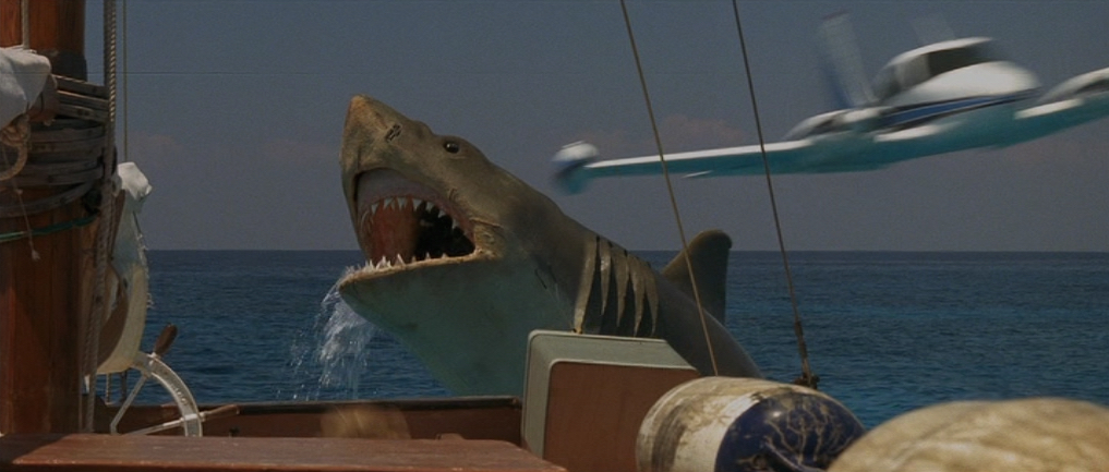 The shark “jumps” out of the water towards the boat, but Hoagie flies low which I think stops the shark from attacking properly. It’s a pretty impressive shot though, and must have been a miracle to get the timing right of the plane flying low with the shark breaching the water at the same time (if indeed it was all done in camera, which to my eyes looks like it is). Sadly a quick shot shows one of the models used in the scene is just the head of the shark and it’s pretty obvious but for the most part, the large shark model is used and it’s well done.