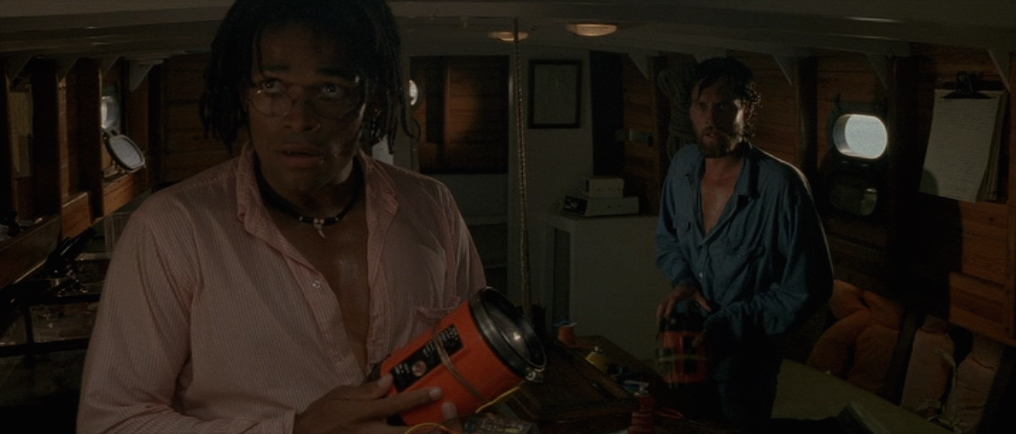 Jake turns on his tracking machine to monitor the shark and decides to create a remote device that should give the shark an electric shock, as long as they are able to get it into the sharks mouth. The shocks won’t be enough to kill the shark but it should be enough to make it retreat. The device used to control the shocks looks like a sort of strobe/torch thing which doesn’t seem to make much sense but fuck it, we’ve made it this far, may as well go along with it. Now for the tricky part… getting it into the sharks mouth.