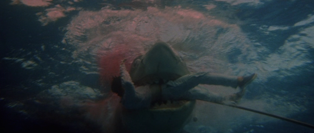 As Michael shouts Jake’s name in despair, we get a shot of Jake struggling in the shark’s mouth underwater. It’s quite cool but there’s some sort of pole sticking out of Jake’s leg as the shark takes him past the camera. Now, I guess this could be the pole with the device attached to it but it looks more like something that was needed to achieve the stunt.