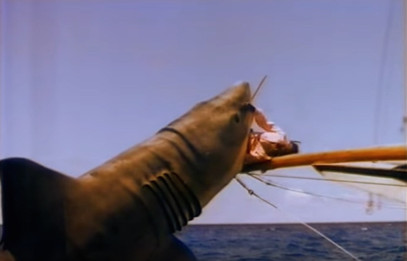 Ellen starts steering the boat toward the shark as it keeps resurfacing in agony until eventually the splintered end of the bowsprit stabs the shark (which is intercut with the famous shot from “Jaws” and the words “smile you son of a bitch!”) causing the shark to…