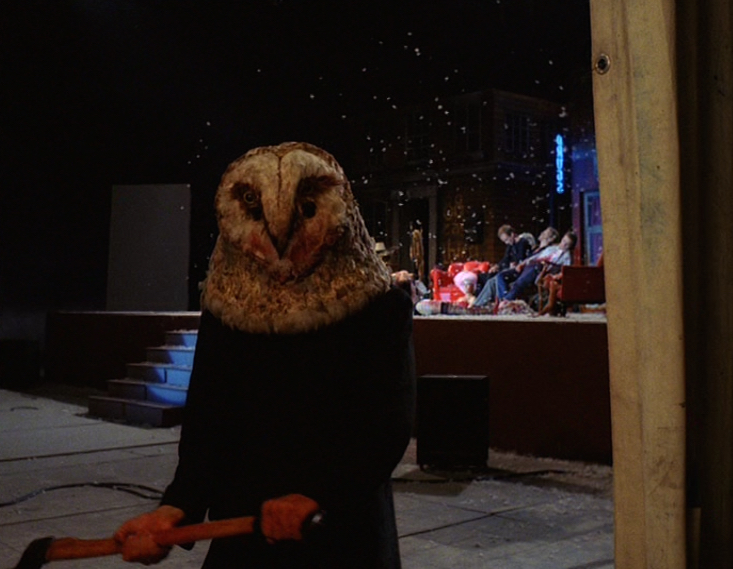 Barbara Cupisti is fantastic as Alicia and she really holds the film together in the later stages of the film. George Eastman is incredibly threatening as the killer; his height and build make him a great villain as already proven by his role in “Anthropophagous”. Here he has the obstacle of wearing a large owl mask which must have surely obstructed his vision and yet still manages to move gracefully. The scene where he arranges his murder victims on stage is incredibly creepy (although one of the “dead” characters is seen blinking – doh!) and the tension as Alicia is creeping around trying to get the key without being heard is so suspenseful I though I was going to end up with a nervous twitch.