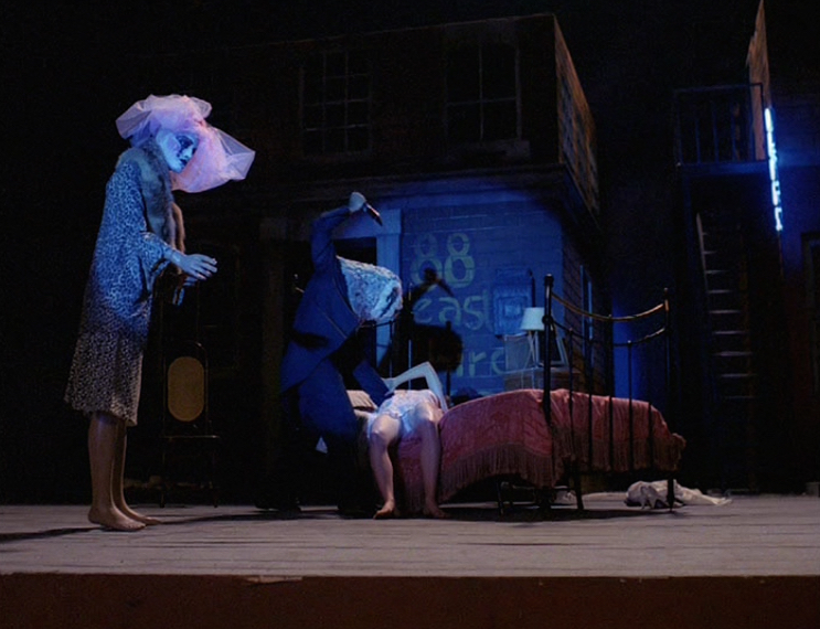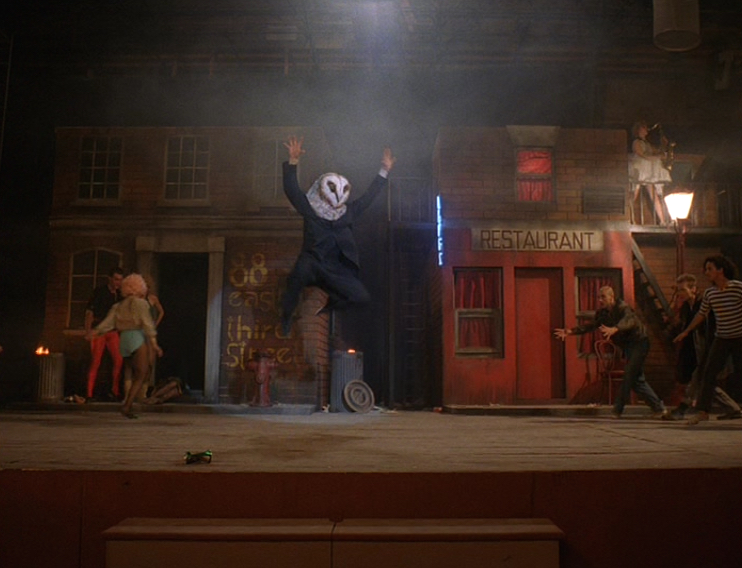 The plot revolves around the rehearsal of a new stage show: “The Night Owl” – described by one character as “an intellectual musical”, directed by Peter (played by David Brandon). The musical tells the story of a serial killer in a rather elaborate owl mask who is then raped by one his victims. At least I think that’s the gist as they don’t really explain a great deal but from what we see it’s basically a lot of people jumping about on stage to some fast paced, slightly sleazy jazz music. It’s one of those productions that makes you wonder who on earth would actually want to sit through it, like the ones in Stallone’s much maligned 80s cheese fest: “Staying Alive” (although I would pay good money to see “Satan’s Alley” done for real). Anyway, during rehearsals, Alicia (played by Barbara Cupisti) sprains her ankle and due to the unbelievably strict dictatorship Peter is running, has to sneak out with her friend Betty to get treatment.