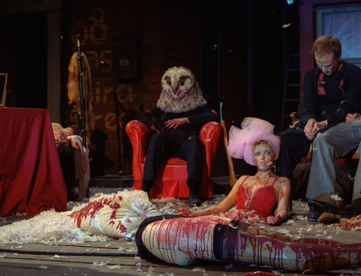 Spoilers – Betty is the first of the group to die and it is this murder that sets up the rest of the film. The police are called and after the commotion has died down, two hapless policemen (one played by Soavi himself) are stationed outside the theatre whilst Peter, seeing the murder as an opportunity to cash in and reap the rewards of the publicity, decides to change the “plot” of the play. Not only that, he locks the key members of cast and crew in the theatre and forces them to work through the night to rehearse the new storyline, much to their displeasure. With the killer at large and now roaming the inside of the theatre with the owl mask on, it’s only a matter of time before more people start dying. Conveniently the policeman are unaware of the commotion inside the theatre as they can’t hear the screams over the sound of the rain and thunder outside.